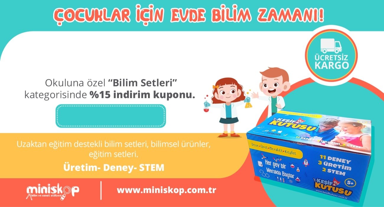 Kurumunuza özel veya özel günler için tanımlanan kupon ile çocuklar, www.miniskop.com.tr adresinde BİLİM SEPETİ’ndeki ürünleri indirimli olarak satın alma şansı elde etmektedir.